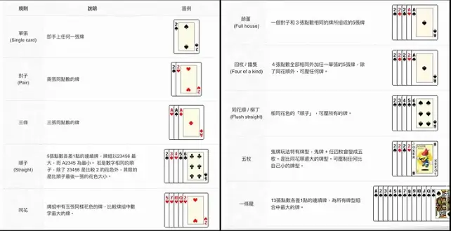 可出单张、对子、三张,或五张组合(顺子、同花顺、葫芦、炸弹等);